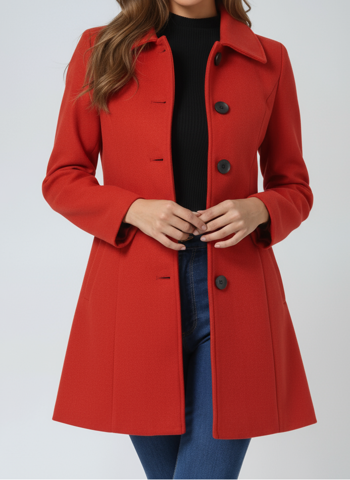 Der leicht taillierte Schnitt verleiht der Silhouette dezent, während die feminine A-Linie für Bewegungsfreiheit und Komfort sorgt. Der einreihige Knopfverschluss und der klassische Kragen machen Leonila™ zu einem vielseitigen Begleiter – perfekt für den Alltag, Stadtbesuche oder elegante Wintermomente.